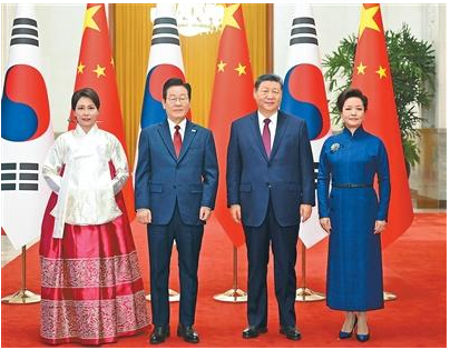 习近平指出,当前世界百年变局加速演进,国际形势更加变乱交织。中韩在维护地区和平、促进全球发展方面肩负重要责任,有广泛利益交集,应当坚定站在历史正确一边,作出正确战略选择。80多年前,中韩两国付出巨大民族牺牲,赢得抗击日本军国主义的胜利。今天更应携手捍卫二战胜利成果,守护东北亚和平稳定。作为经济全球化的受益者,中韩要共同反对保护主义,践行真正的多边主义,为推进平等有序的世界多极化、普惠包容的经济全球化作出贡献。